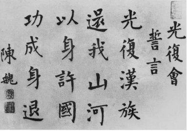 光复会初创,蔡元培出任首任会长,陶成章任副会长——他是实际的主事者,龚宝铨、章太炎都是核心力量。光复会誓词即宗旨:“光复汉族,还我河山,以身许国,功成身退。”主张除文字宣传外,更以暗杀和暴动为主要革命手段。作为一个地下秘密组织,光复会在草创时期选择会友极为严格,会内制度亦极严。会员大都彼此不相识,只有多次秘密相聚者才知对方是会友,而且他们制定了一套暗语以及动不同手指头的手势,用以联络识别。